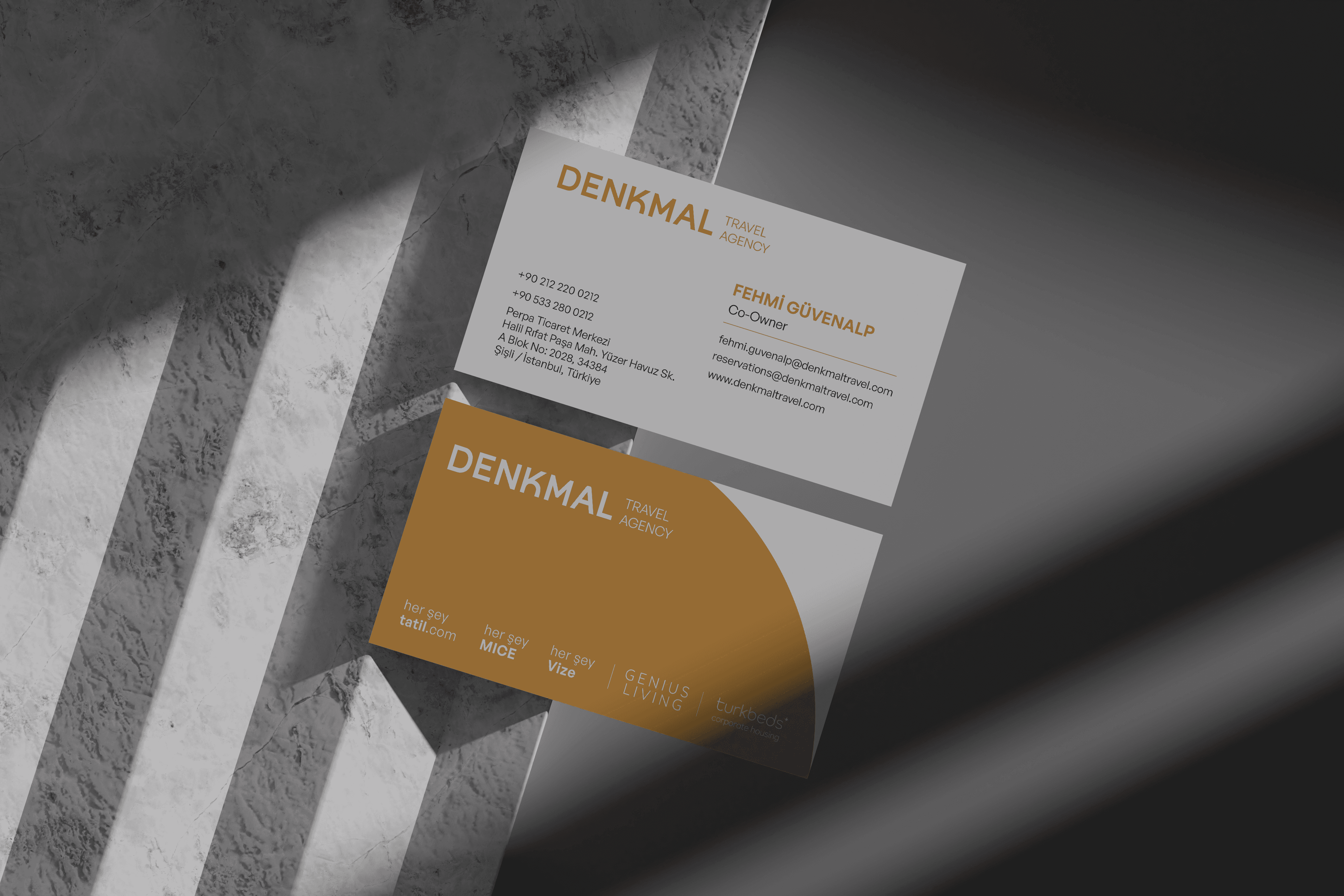 Denkmal markası için oluşturulan kurumsal logo tasarımı, modern tipografi ve güçlü renk kullanımıyla desteklenmiştir. Turizm sektörünün dinamizmini yansıtan renk paleti sayesinde marka daha dikkat çekici bir karakter kazanmıştır.